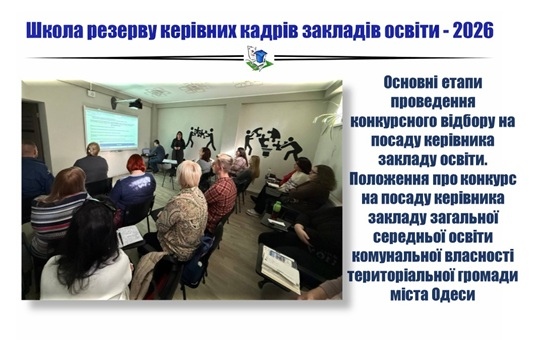 17 березня 2026 року для слухачів Школи резерву керівних кадрів закладів освіти м. Одеси проведений семінар-практикум “Основні етапи проведення конкурсного відбору на посаду керівника закладу освіти. Положення про конкурс на посаду керівника закладу загальної середньої освіти комунальної власності територіальної громади міста Одеси“ на базі освітнього простору “CreadED”.