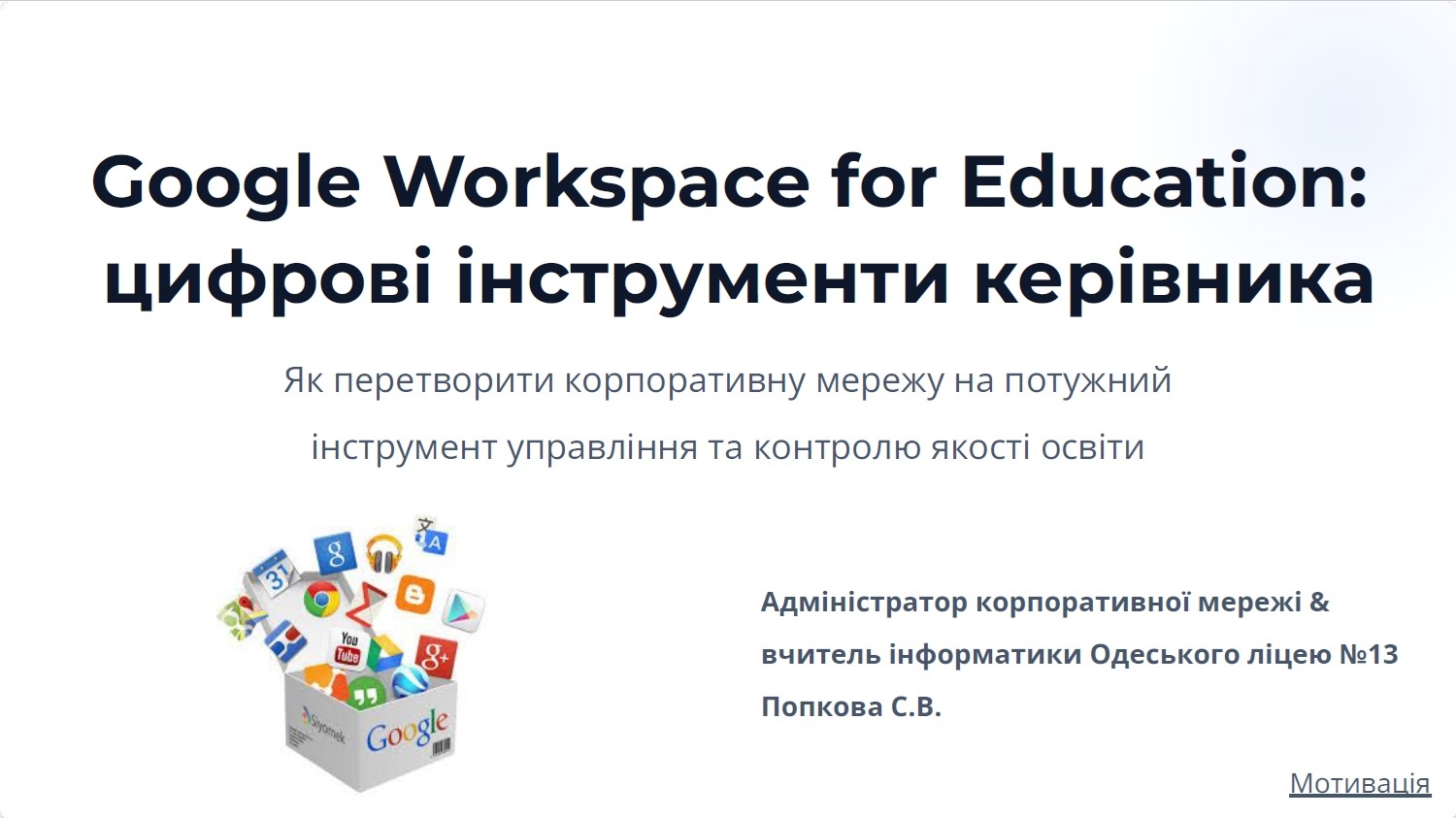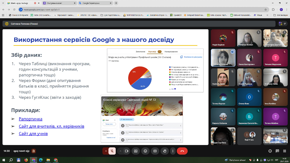 Адміністратор корпоративного акаунту ліцею та вчитель інформатики Попкова Світлана поділилася досвідом впровадження та використання Google Workspace for Education як сучасного цифрового інструменту керівника закладу освіти.