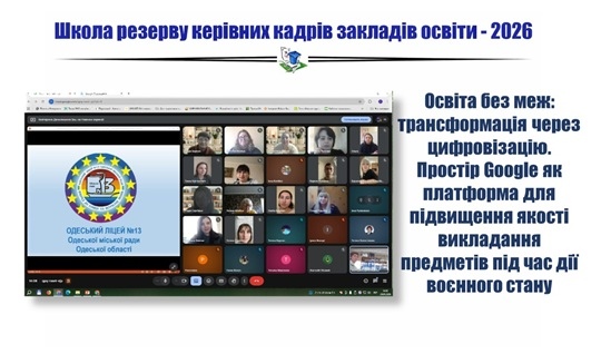 29 січня 2026 року для слухачів Школи резерву керівних кадрів закладів освіти м. Одеси відбувся майстер-клас «Освіта без меж: трансформація через цифровізацію. Простір Google як платформа для підвищення якості викладання предметів під час дії воєнного стану».