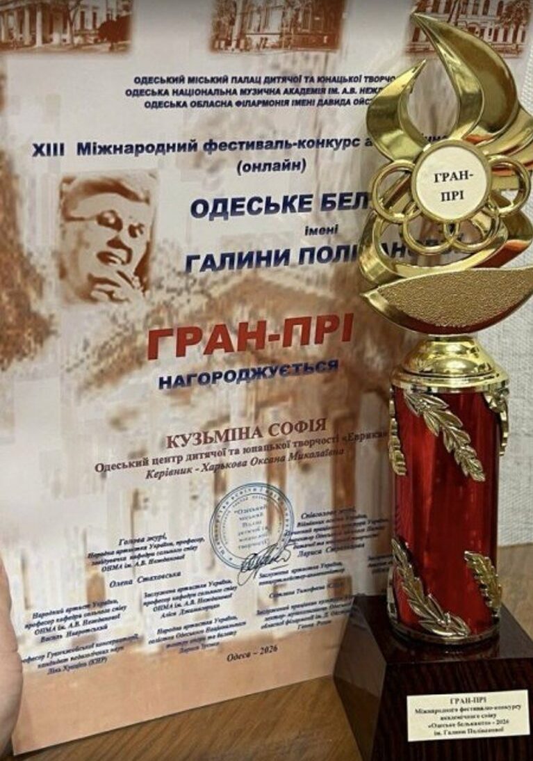 Гран-прі ХІІІ Міжнародного конкурсу «Одеське бельканто» 2026 року здобула Софія Кузьміна — вихованка вокальної студії «Конфетті» (керівник Оксана Харькова) Одеського центру дитячої та юнацької творчості «Еврика». Переможниця продемонструвала вражаючий вокальний діапазон, сценічну майстерність і впевнене володіння технікою академічного співу.