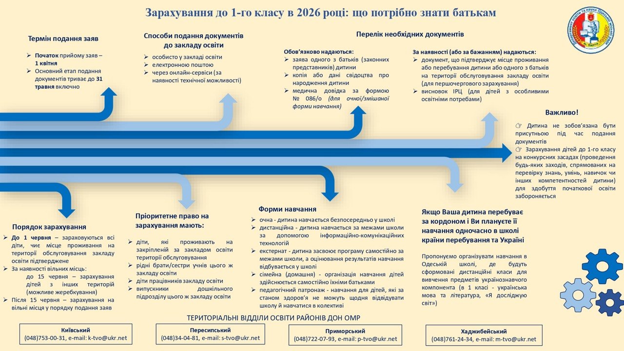 👉 Увага! Зарахування дітей до 1-го класу на конкурсних засадах (проведення будь-яких заходів, спрямованих на перевірку знань, умінь, навичок чи інших компетентностей дитини) для здобуття початкової освіти забороняється.
